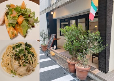 新富町駅から2分の隠れ家的イタリアン。ランチは1200円~、+500円で牡蠣とほうれん草のパスタも選べます。プリプリの牡蠣がたっぷりなので牡蠣好きの方は一度食べてみてほしい逸品です