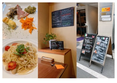 ランチは肉・魚・パスタの3種類から選べ、全てのランチには新鮮で彩り豊かな野菜たっぷりのサラダと前菜、自家製パン付き。サラダもメインも盛り付けがおしゃれでボリュームもあるので満足度が高いお店です。ちょっと分かりづらい路地に佇む隠れ家的なお店ですが、ランチには行列ができる人気店です。